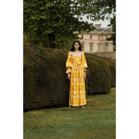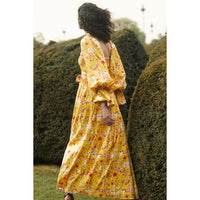 Long silhouette dress wide with rowing details upper part, balloons sleeves with elastic collected and belt. Exclusive print, inspired by transmitting joy, freedom, hope through its colors. Base: Rosella.