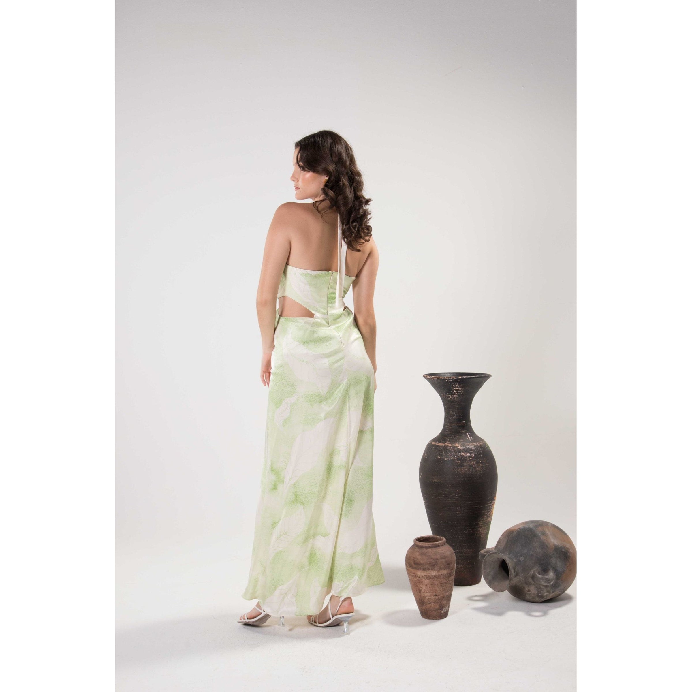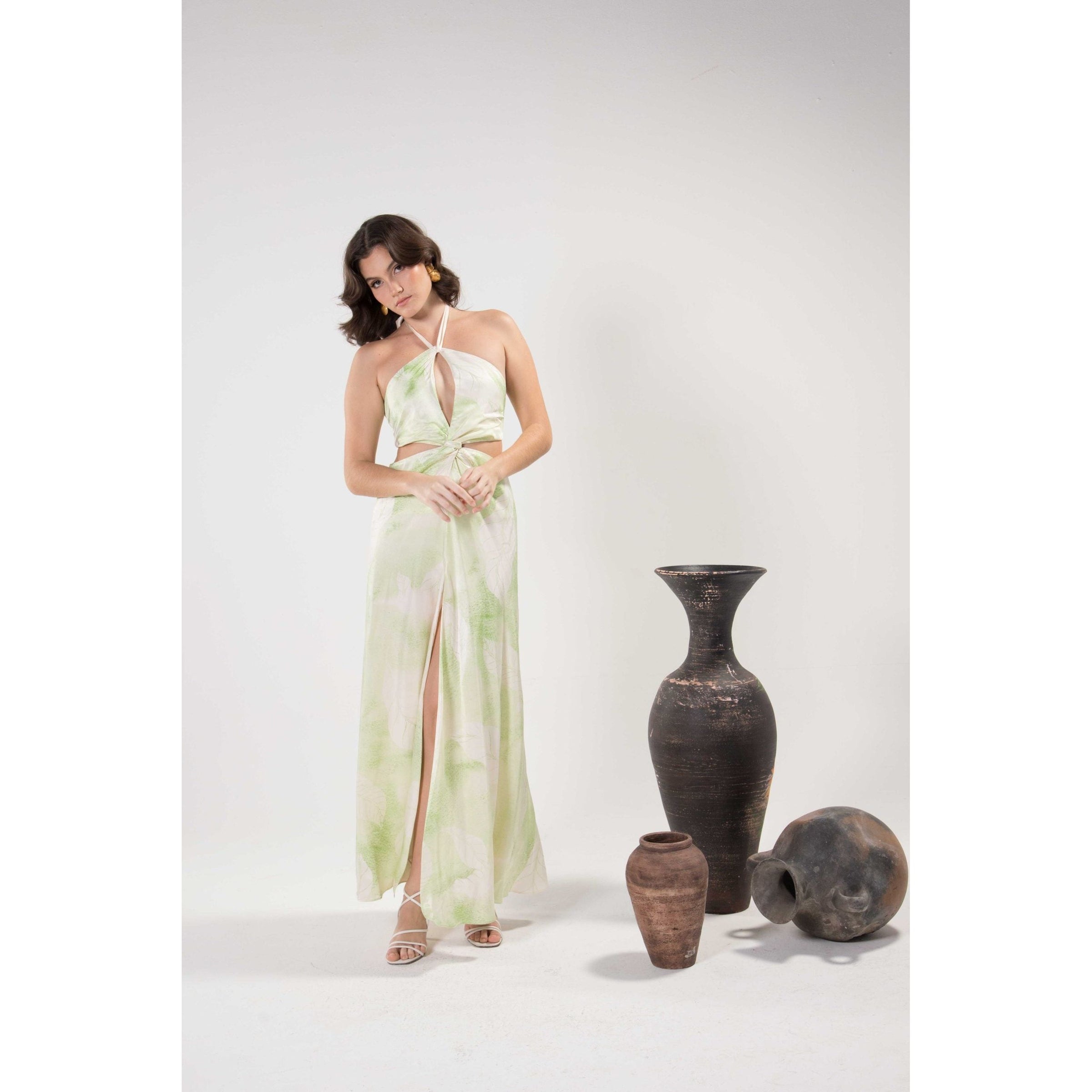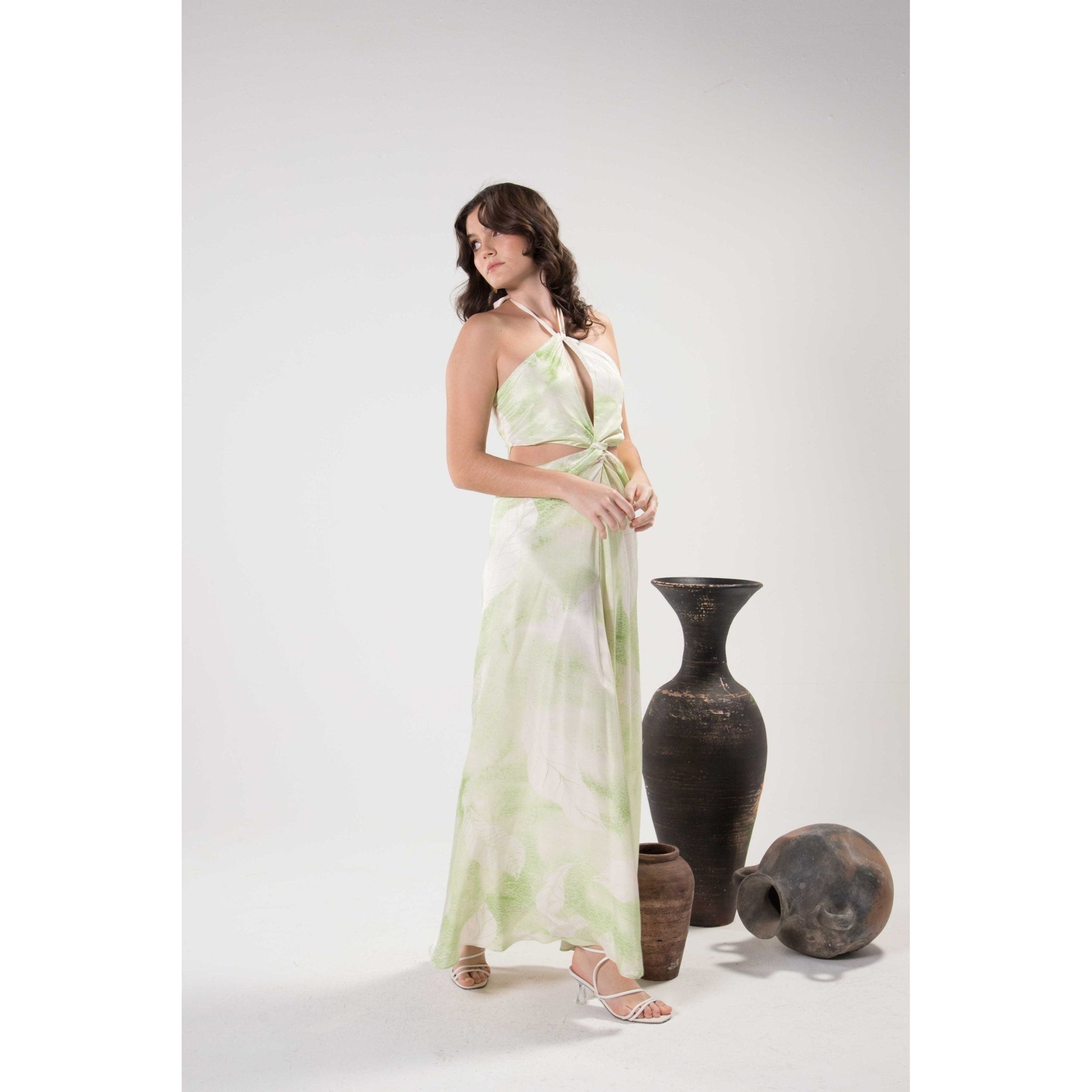 This dress is made of luxurious tencel viscose fabric. Features our new watercolor prints, with a halter neck that plunges to a knot at the center.