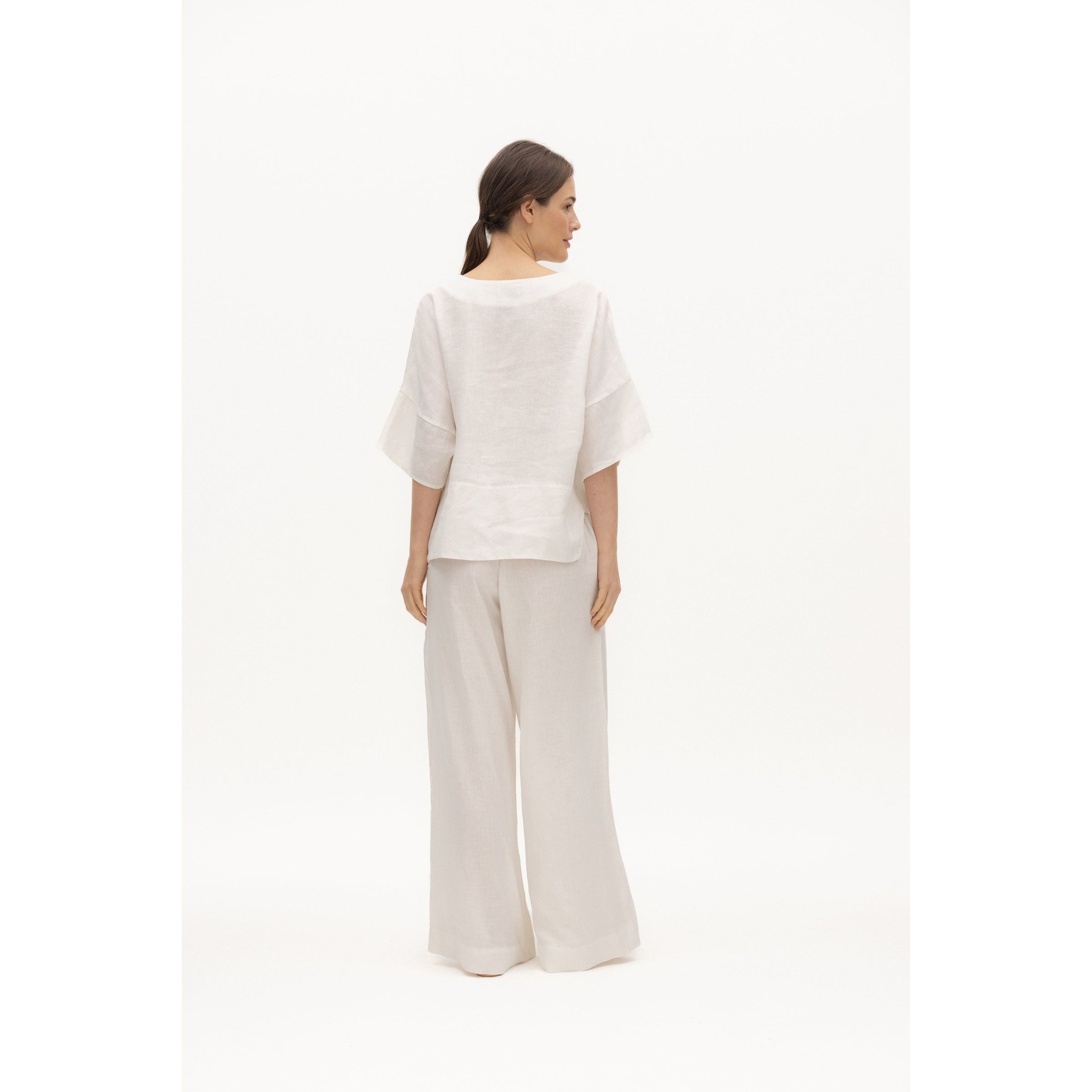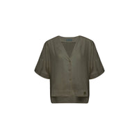 Olive green blouse, straight flap and V neckline, short sleeve (with fallen shoulders) with sleeves in sleeves. Front with buttons. Asymmetric long. Detail embroidered on the side. Piece with pre-talled and softened.
