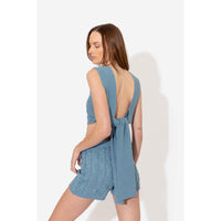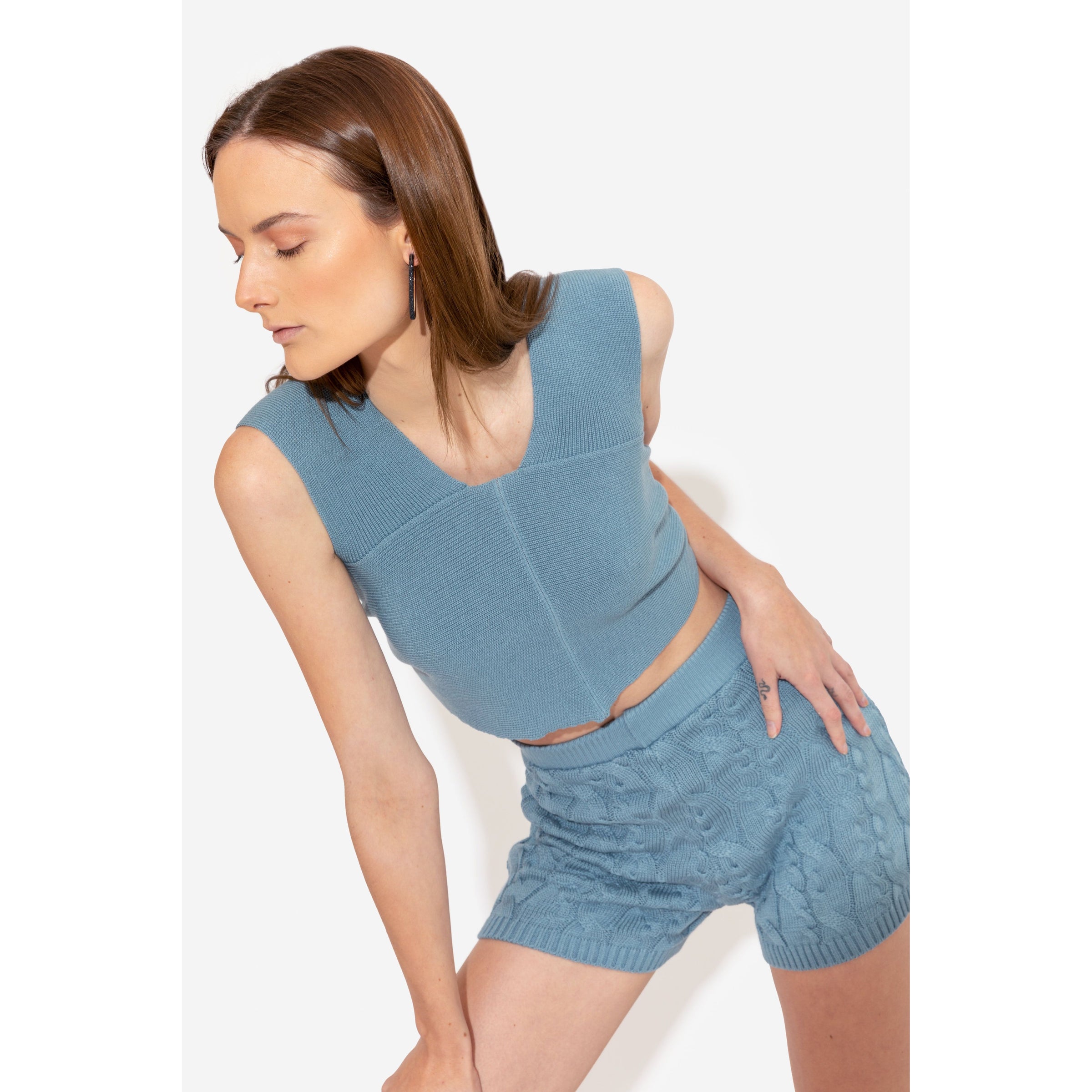 Blue braided knit top and matching bralette set, featuring a strappy halter neck and adjustable back ties that can be knotted to your desired fit.
