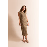 Long crochet knit dress in marbled coffee color and round neck, sleeveless, with a side slit. It has a very elegant design, it highlights the female figure through the fabric.