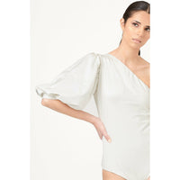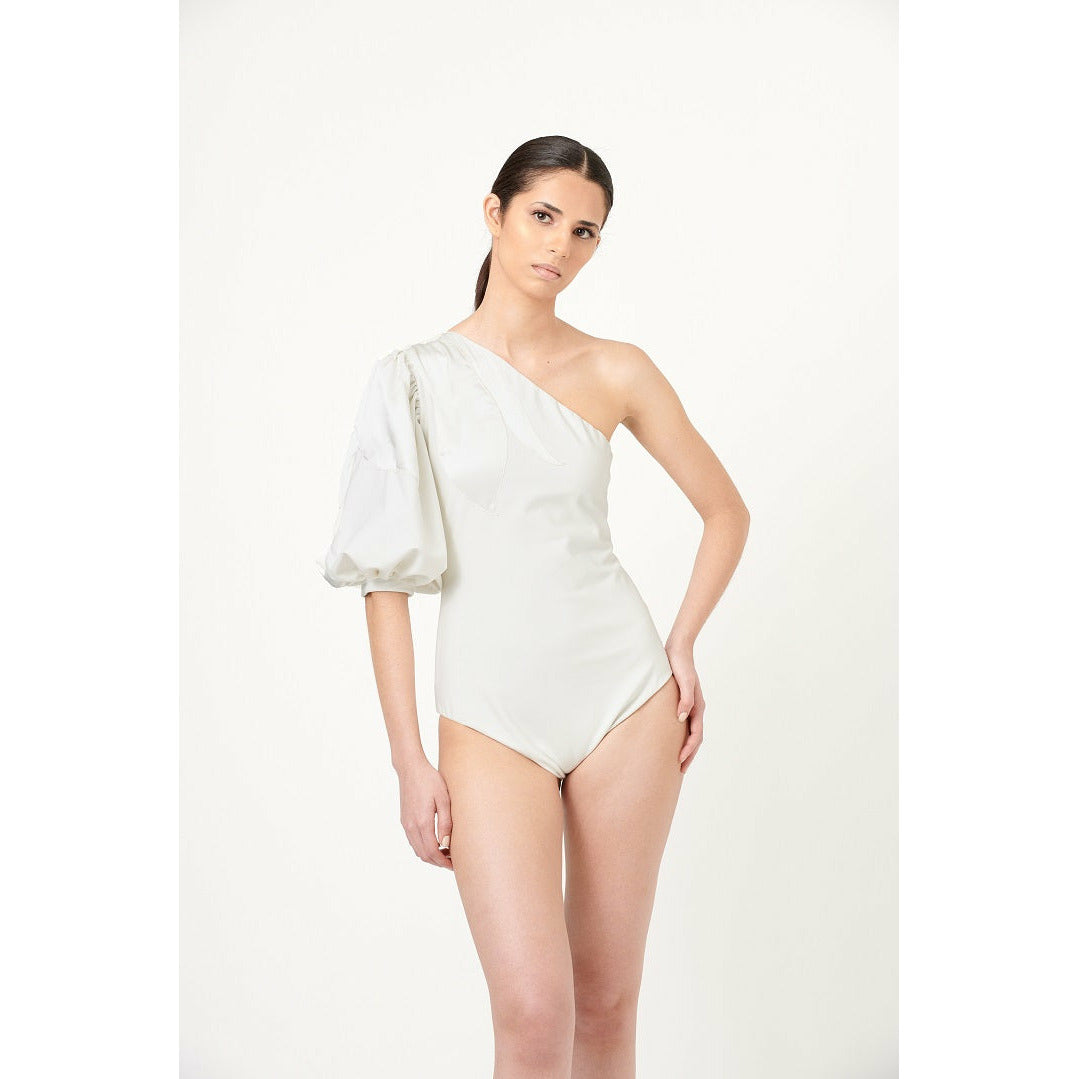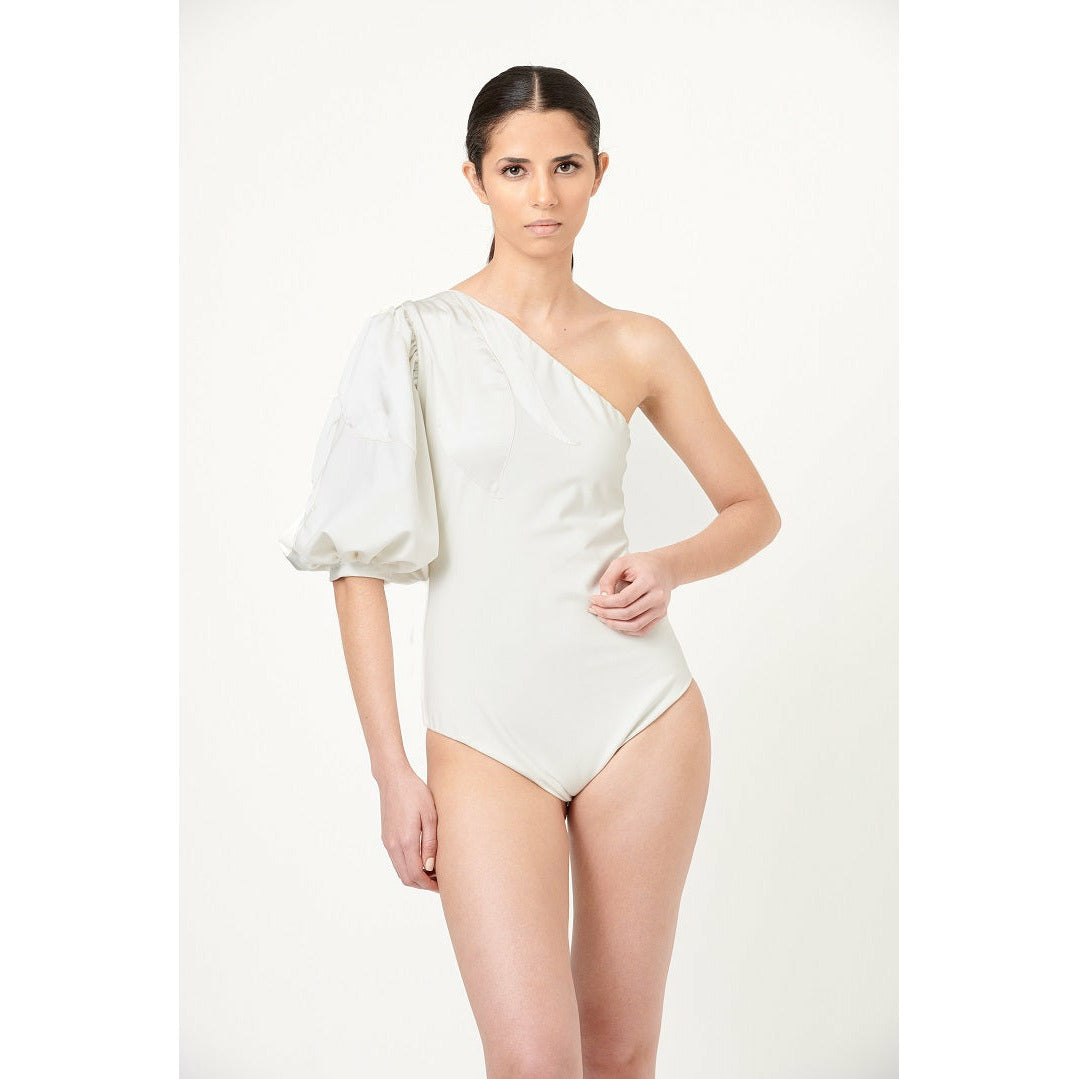 This beautiful asymetrical body features a diaganol neckline, and one voluminous sleeve. Lasercut aplique in the shape of the flór de izote adds a unique touch.