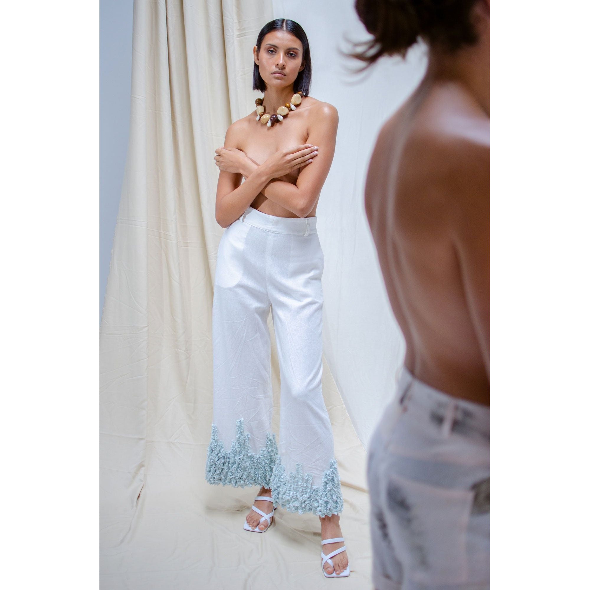Palazzo pants, side pockets, wide boot with textured design detail, adjustment in the rear.