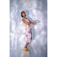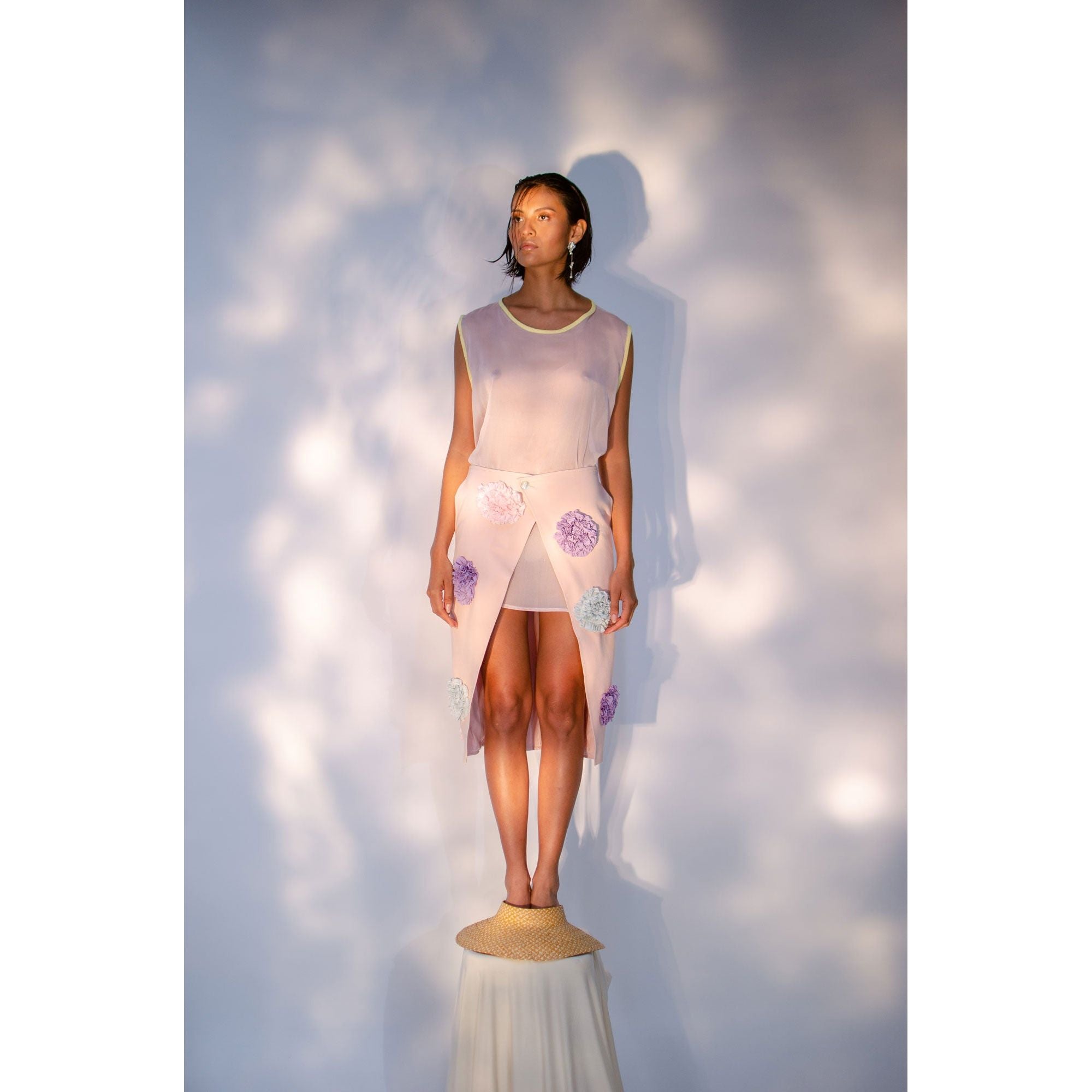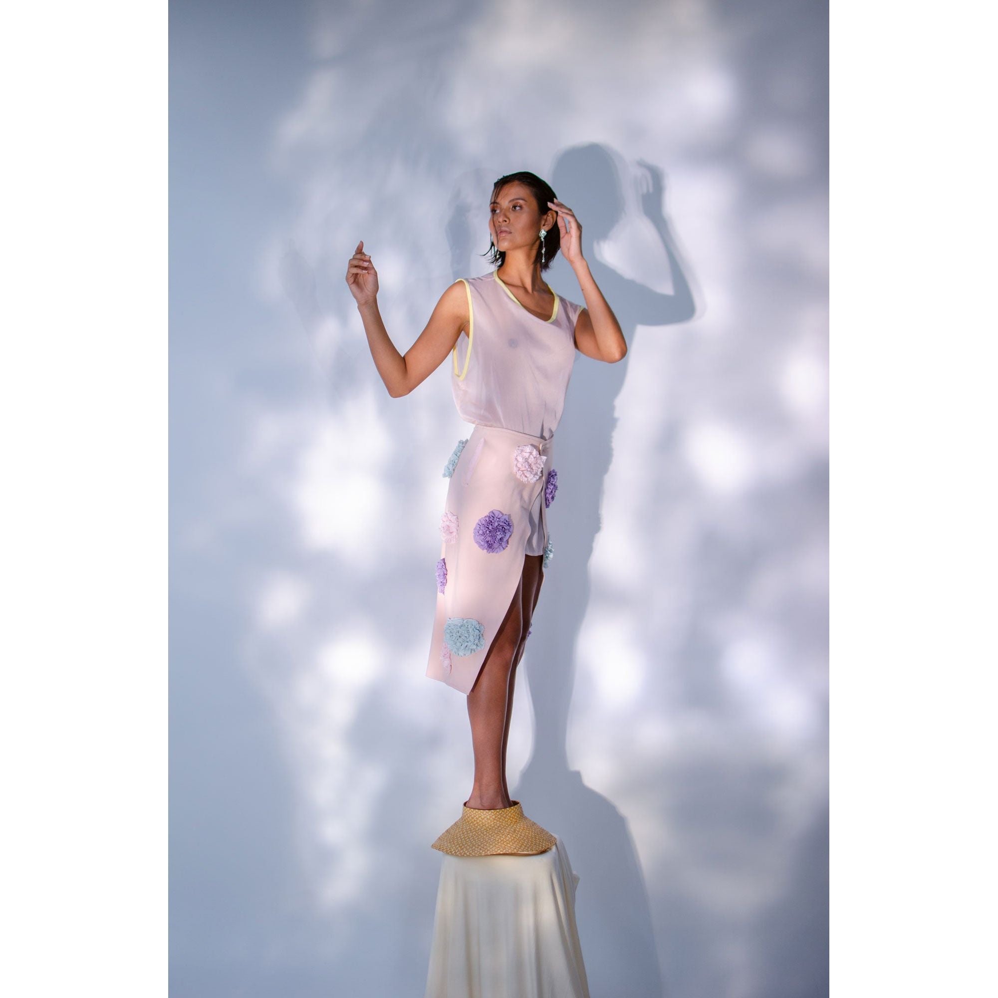 Midi skirt of overlapping, adjustment with a small cross button in front center, completely lined inside, side pockets, decorate artisanal design details as rosettes or oysters in the body of the piece.