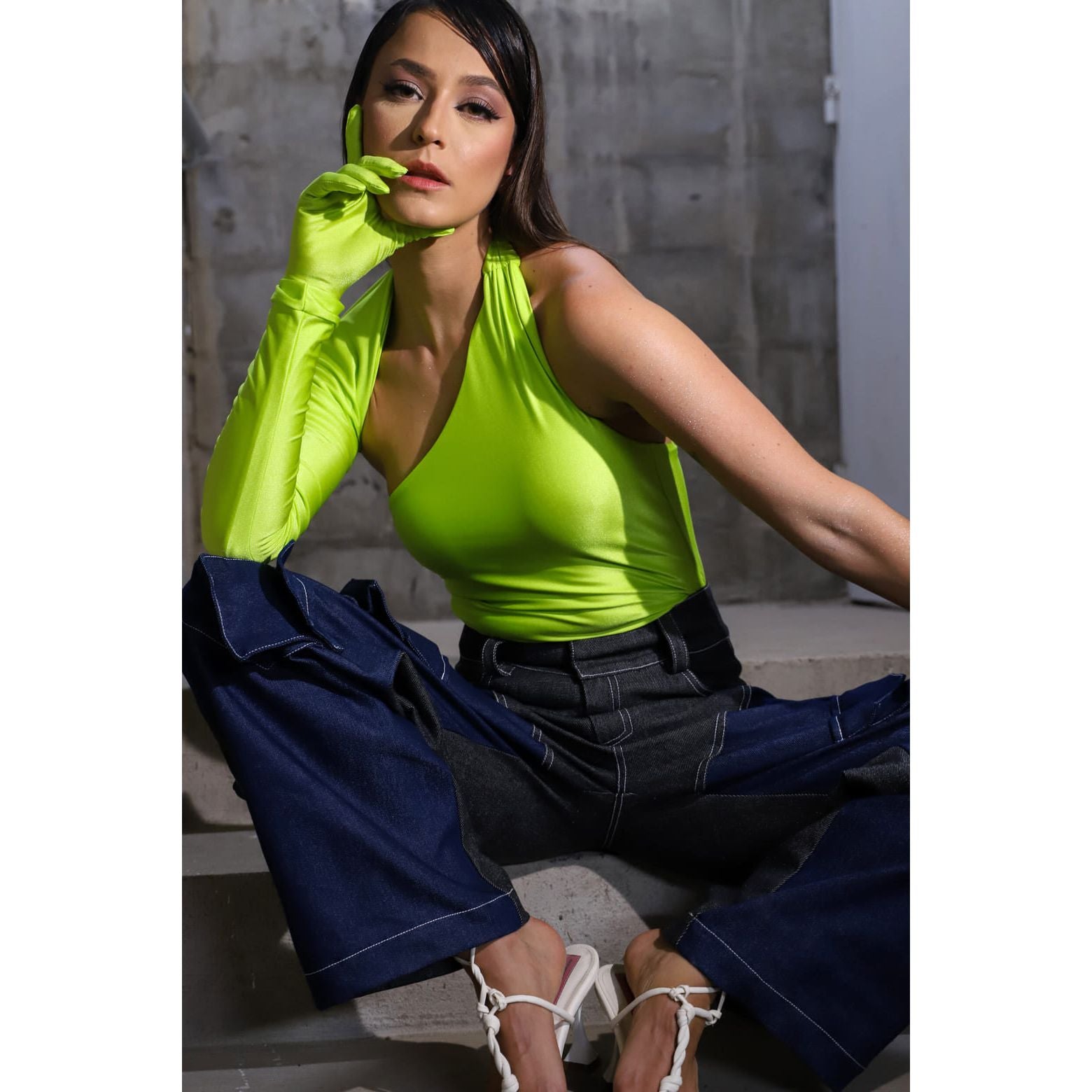 Blouse type "body" with one shoulder, long sleeves, contains removable gloves as a gift.