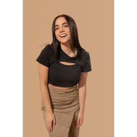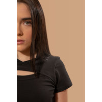 Black T-shirt made with high-quality light Lycra. This versatile shirt features a waist-length design, circular neckline, and an opening at the neck for added style.