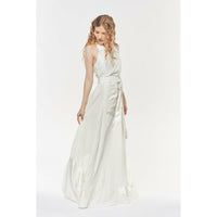 Double-breasted with lapels this gorgeous maxi dress fastens with an incorporated fringed tie. The back features an elegant mesh panel that adds a romantic touch. Silk satin, lasercut aplique throughout in the form of the flor de izote.Models are wearing size S and are 5'8".