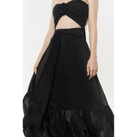 Tencel Linen Chiffon, Mulberry Silk, and Polyester Mesh. This full length skirt features a sheer mesh lower decorated with silk lasercut apliqué in the form of flor de izote petals. Includes incorporated bow.