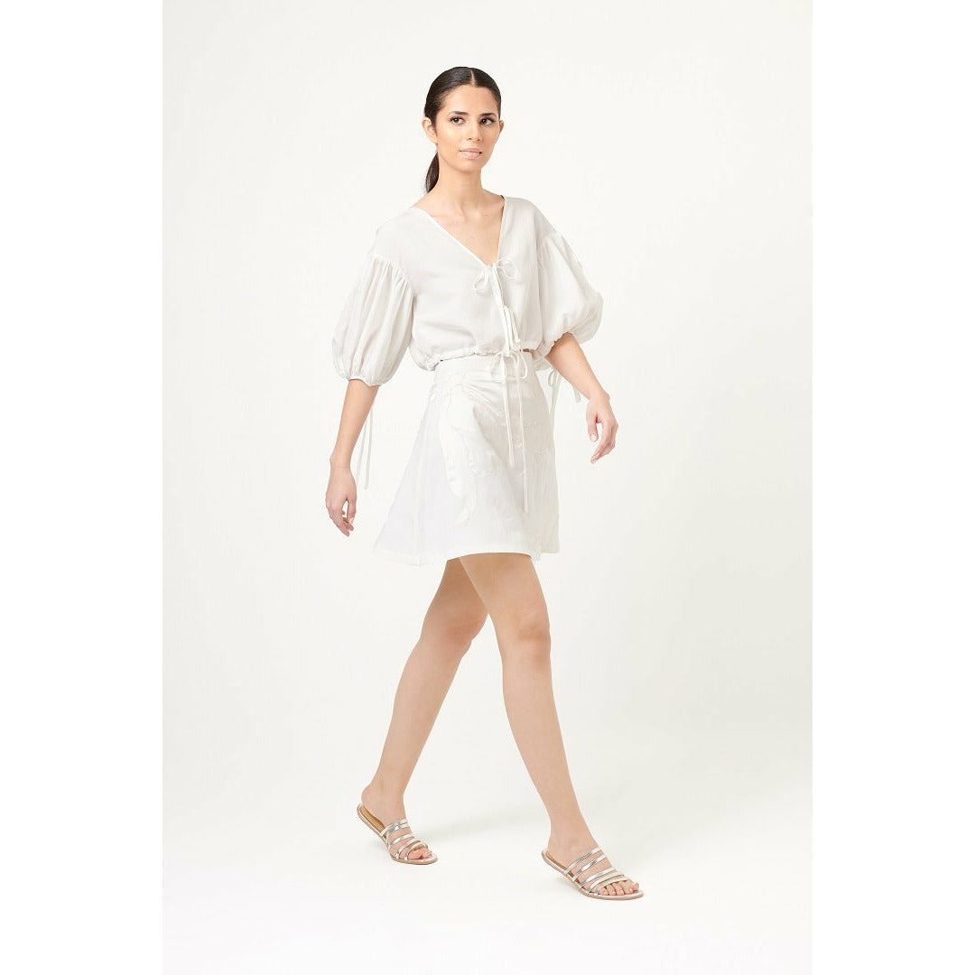 This feminine, high- waisted, A-line skirt is versatile enough to be styled for casual or elegant occasions. Silk-satin laser-cut applique fit like together puzzle pieces in the shape of flor de izote petals. Zip closure in the back.